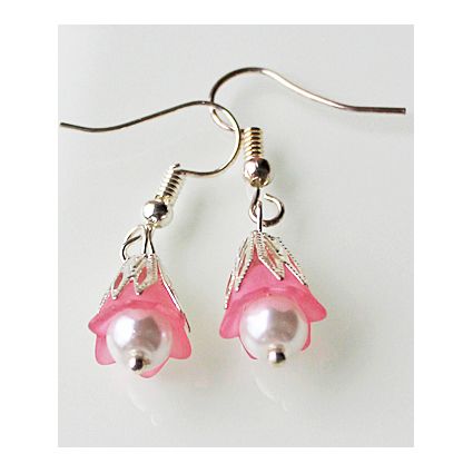 Oorbellen met zachtroze en zilver filigrain kralenkapje en 6mm glaspareltje.