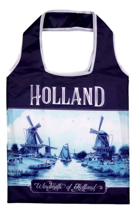 Een opvouwbare tas versierd met een Nederlands molenlandschap en de tekst "Windmills of Holland". Deze opvouwbare en herbruikbare kunststof boodschappen tas wordt geleverd in een klein makkelijk mee te nemen zakje dat met een touwtje gewoon vast zit aan de tas. Goed alternatief voor de plastic boodschappen tasjes uit de winkels. Heel makkelijk om mee te nemen als je snel wat boodschappen moet bewaren. De tas meet 38 cm bij 38 cm.