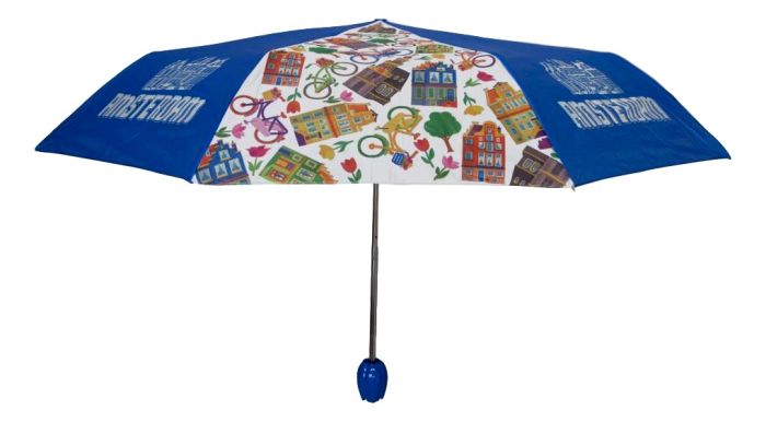 Mooie blauwe paraplu versierd met een compilatie van Amsterdamse scenes als fietsen, grachten en tulpen.
