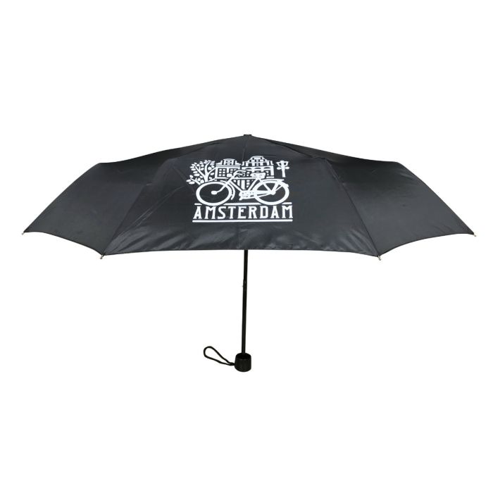 De paraplu is zwart met een witte fiets en grachtenhuizen erop geprint boven het woord "Amsterdam".