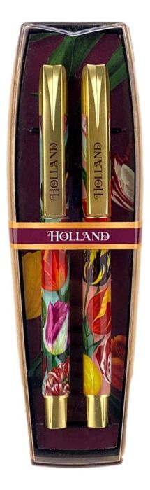 Deze set van 2 pennen is versierd met tulpen op een groene en tulpen op een paarse achtergrond.