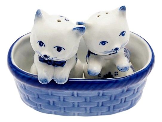 Leuk keramisch delfts blauwe poezen in mand, peper en zout stel.