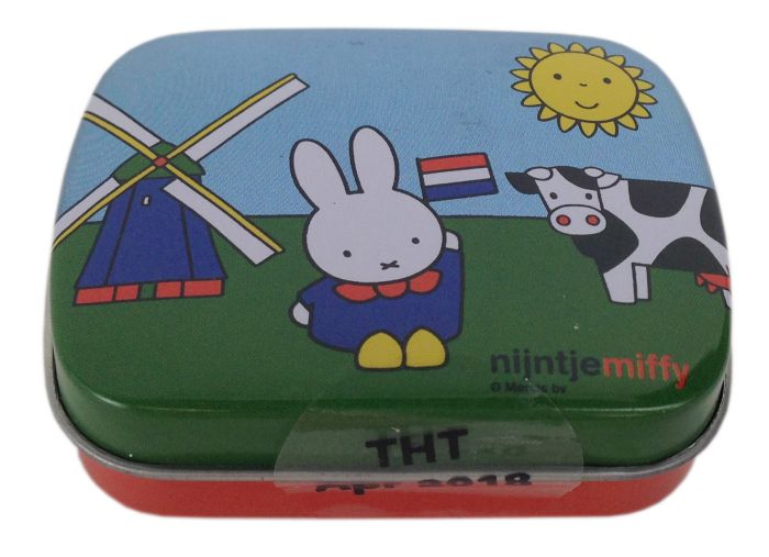 Blikje met Nijntje met Windmolen en Koe, gevuld met pepermuntjes. Afm is 6x5cm.