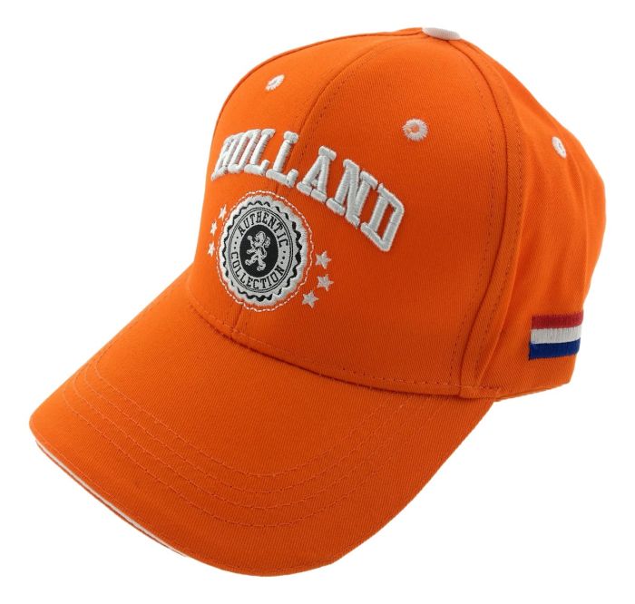 Fel oranje pet met de tekst Holland in het wit op de voorkant, het wapen van Nederland in het rond daaronder en de Nederlandse vlag op de zijkant. De pet is verstelbaar en geschikt voor iedereen.