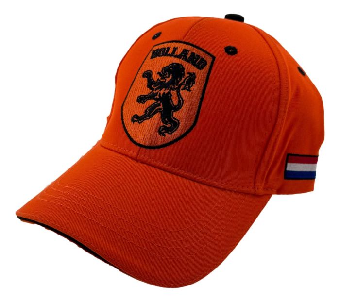 Fel oranje pet met wapen van Holland op de voorkant en de Nederlandse vlag op de zijkant. De pet is verstelbaar en geschikt voor iedereen.