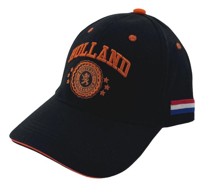 Zwarte pet met het oranje letters Holland op de voorkant en de Nederlandse vlag op de zijkant. De pet is verstelbaar en geschikt voor iedereen.
