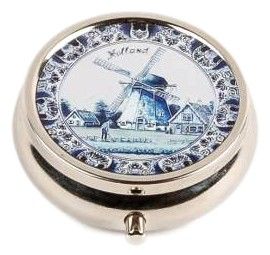 Pillendoosje met ge-etste voorzijde, Delfts blauwe molen. Het doosje is gemaakt van metaal.