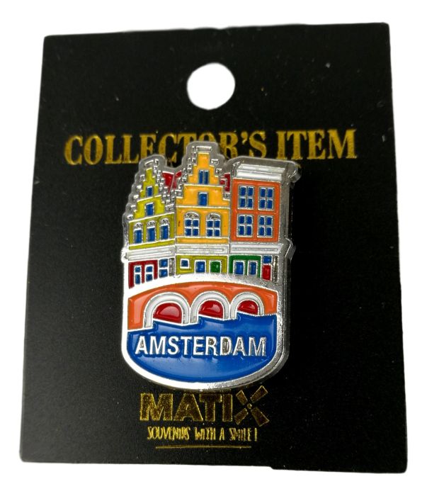 Kleine typisch Hollandse metalen pin voor op de revers van een jas of blazer. De pin is versierd een typisch Amsterdamse gracht en de tekst 'Amsterdam'.