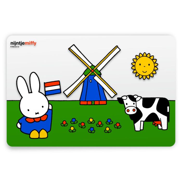 Deze vrolijk gekleurde Nijntje placemat laat Nijntje met een Nederlands vlaggetje, een molen en een koe zien.