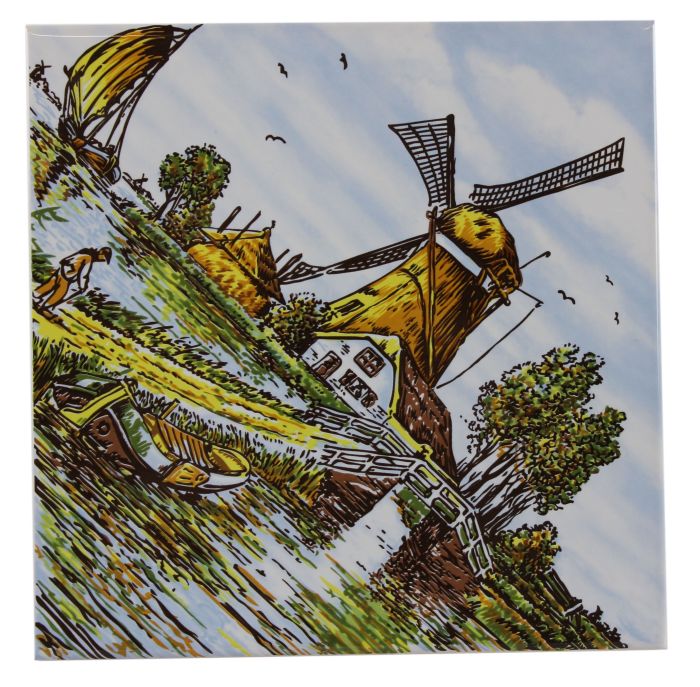 Polychrome tegel met een molen en een boerderij op de achtergrond.