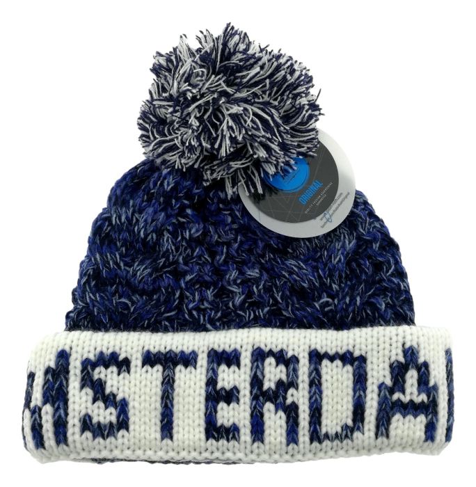 Stijlvolle wintermuts in het blauw/navy met wit. De rand van de muts is versierd met de tekst "Amsterdam" en een grote pompon aan de bovenkant.