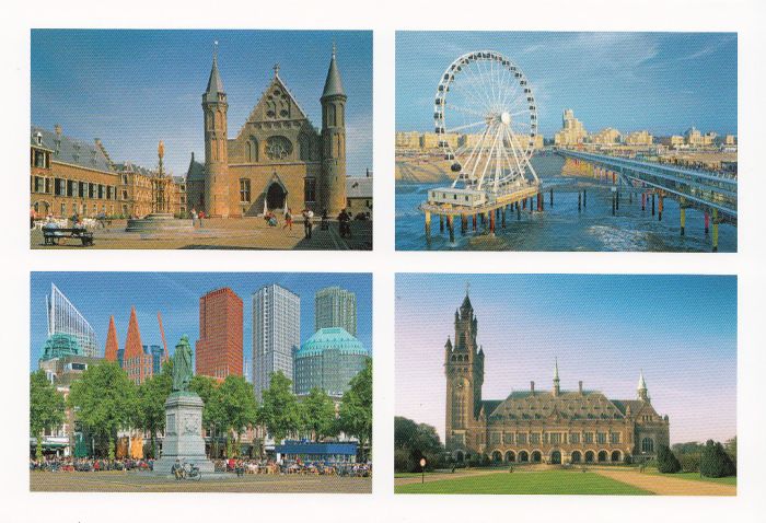 Deze stevige postkaart laat gezichten zien uit Den Haag en Scheveningen. De hofstad wordt hier op zijn mooist, op dagen met schitterend weer getoond.