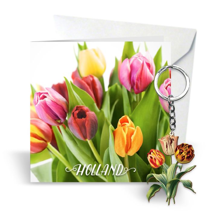 Deze vrolijke postkaart met een mooie tulpen, en bijpassende sleutelhanger zijn een leuke manier om iemand te feliciteren of te verrassen. Een envelop wordt meegeleverd.