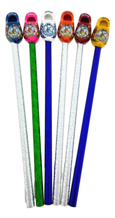 De potloden hebben aan de bovenkant een gekleurd klompje. De potloden schrijven grijs (grafiet).
