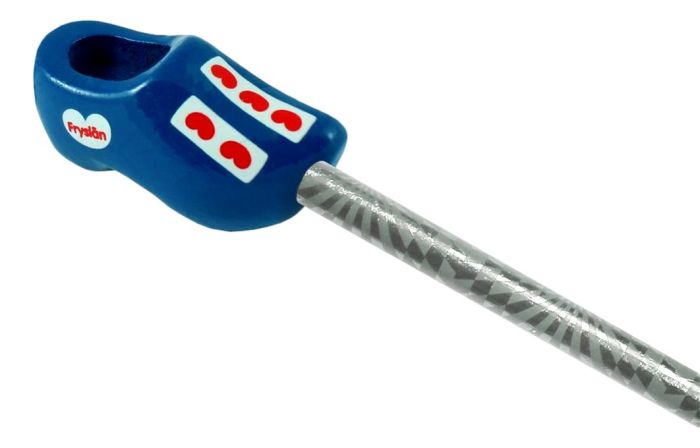 Glimmend zilverkleurig potlood met aan de bovenkant een blauw klompje met de bekende Friese vlag.Op de zijkant van het klompje staat een wit hartje met daarin "Fryslân".