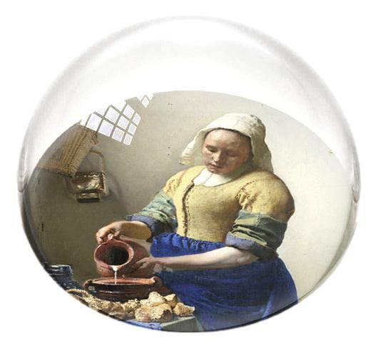 Presenteer uw documenten en papieren op een elegante manier met onze Presse Papier in de vorm van een halve glazen bol. Met een prachtige afbeelding van het schilderij 'Het Melkmeisje' van Johannes Vermeer aan de onderkant, is dit de perfecte toevoeging aan uw bureau of werkruimte.