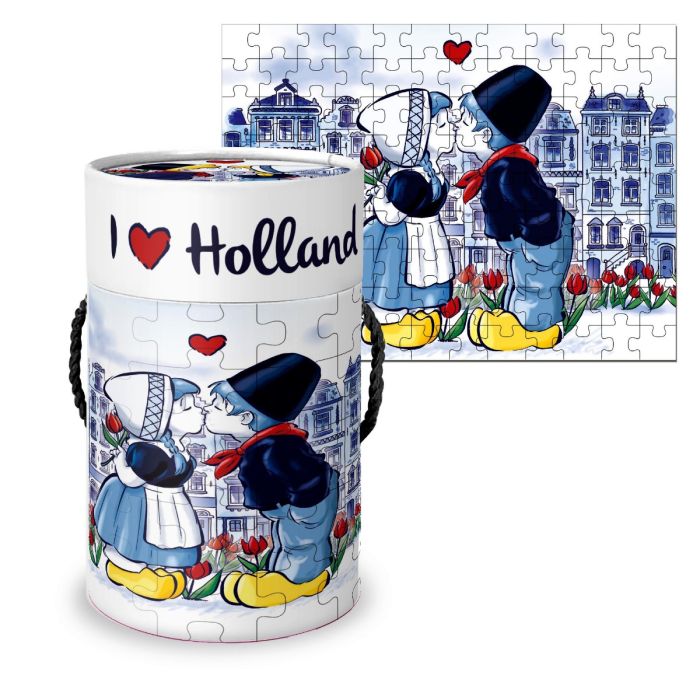 Leuke kleine puzzel met een tekening van het beroemde kussende paar  omringd door tulpen in Amsterdam. De puzzel zit een mooie kartonnen koker en heeft 108 stukjes.