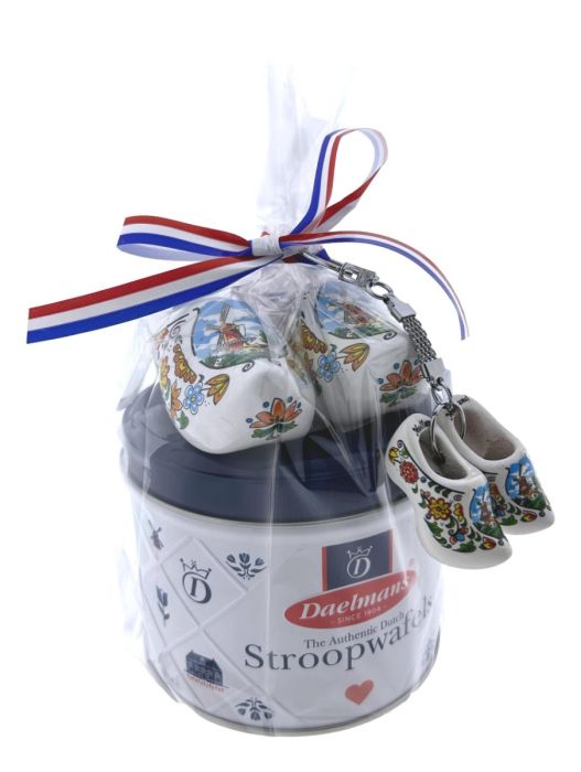 Dit vrolijke blikje met wit gekleurd klompje en bijpassende sleutelhanger komt uit onze regenboog serie ! Leuk versierd met een lintje en een cellofaanzakje zijn deze Delfts blauwe blikjes zijn heel geschikt om als klein presentje weg te geven als relatiegeschenk bij een congres of presentatie. Alle blikjes worden door ons pas op het moment van bestelling voor u verpakt en versierd. Hierdoor heeft u altijd verse stroopwafels. De stroopwafels zelf zijn lang houdbaar. Het Daelmans stroopwafel blikje heeft een diameter van 10 centimeter. Elk blikje bevat 8 lekkere stroopwafels met een diameter van 8 cm. Heeft u een cadeau of geschenk nodig voor een grote groep? Geen probleem, wij kunnen snel leveren. Details