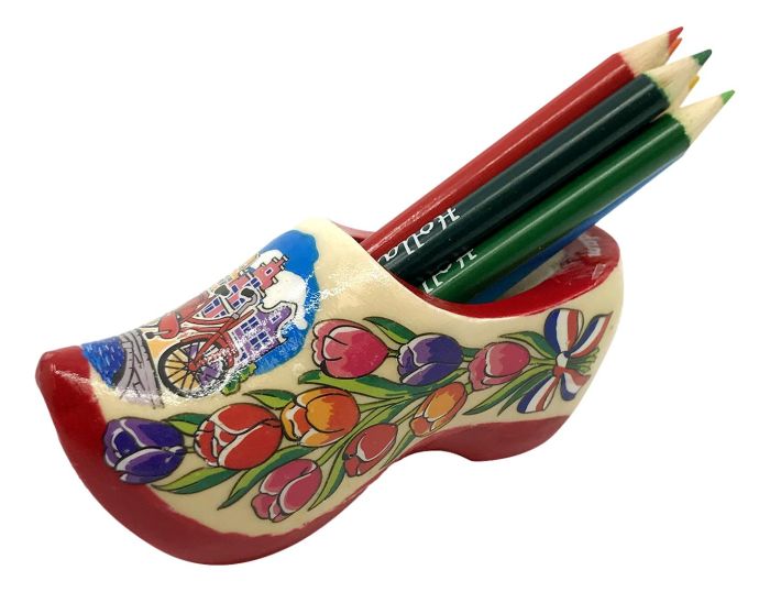 Rode zool houten klomp gedecoreerd met Amsterdamse taferelen gevuld met kleurpotloden. In de zool zit een puntenslijper.
