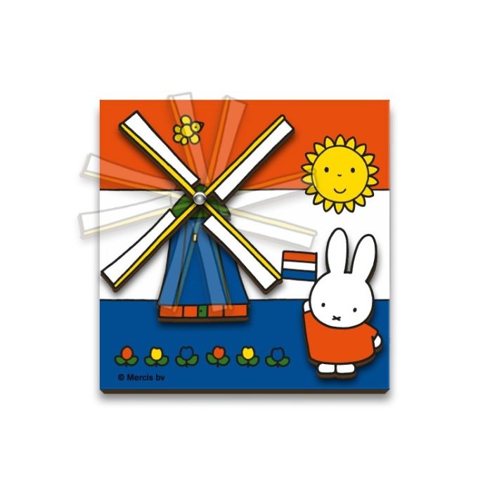 Mooie houten magneet versierd met Nijntje met vlaggetje bovenop een Nederlandse vlag met een windmolen waarvan de wieken echt kunnen draaien.