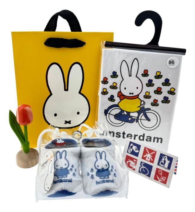 Op zoek naar een leuk typisch Nederlands cadeau voor een nieuwe aanwinst ? Deze Nijntje baby cadeauset met Nijntje baby kleding geeft de nieuwe baby een warm welkom in de Nederlandse wereld ! Dit is een hele tas vol met Nijntje geschenken en een mooi cadeaukaartje. De tas bevat een Nijntje baby t-shirt dat een goede periode gedragen kan worden (maat 86, geschikt voor kinderen van 12-18 maanden) en kleine baby slofjes voor warme voeten en de eerste stapjes. De slofjes hebben anti-slip noppen aan de onderkant. Een houten Hollandse tulp geeft de baby kamer gelijk een Nederlands tintje. En de bijpassende papieren Nijntje tas maakt het helemaal af. Inhoud van het geschenkpakket:
