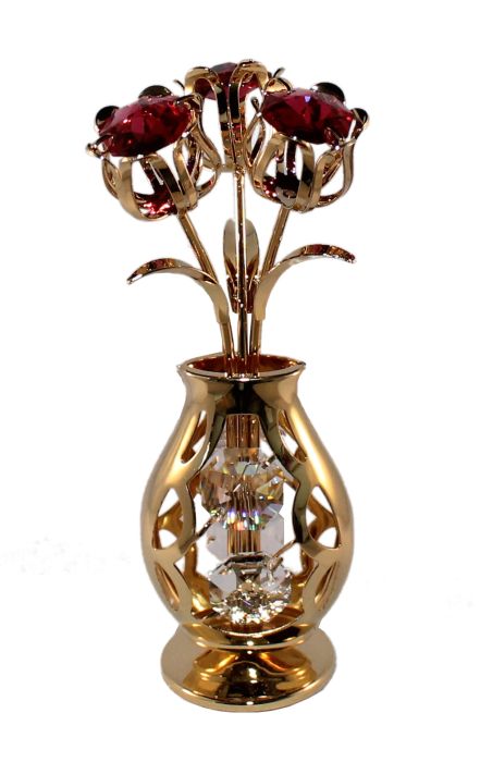 Mooie goudkleurige tulpenvaas, versierd met grote heldere Swarovski strass kristallen. Elke tulp is een grote, bordeauxkleurige Swarovski strass kristal.