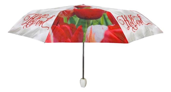 Mooie rode paraplu versierd met tulpen foto's en de tekst "Holland"