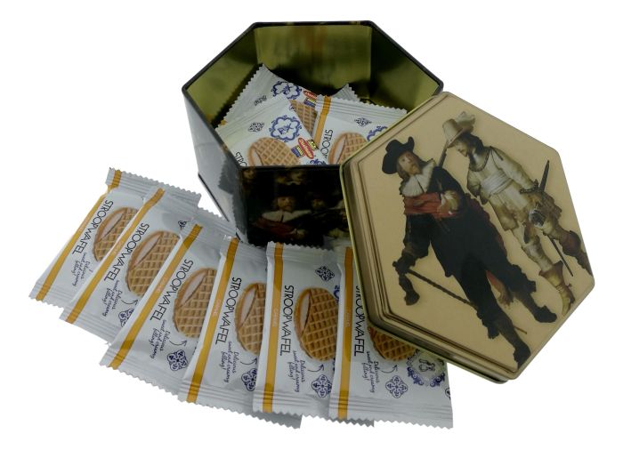 Dit cadeau bestaat uit een mooi tinnen blik versierd met een detail van het beroemde Rembrandt schilderij "De Nachtwacht". Cadeau verpakt in een cellofaan zakje en met een bijpassend goudkleurig lintje dichtgebonden. Het blik is gevuld met echte Daelmans ministroopwafels, 10 stuks maar liefst. Dit stevige blik is ook perfect te gebruiken nadat de stroopwafels opgesmikkeld zijn, en dus een heel mooi typisch Nederlands geschenk om nog vele jaren te bewaren als herinnering. Het blik is zeskantig van vorm en meet ongeveer 12 cm bij 14 cm.