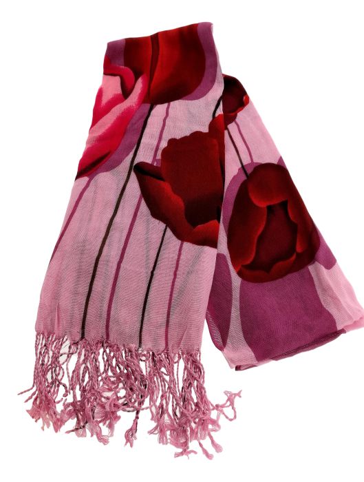 Langwerpige Robin Ruth in Fucsia versierd met fel gekleurde tulpen. De sjaal meet 180 cm bij 50 cm.