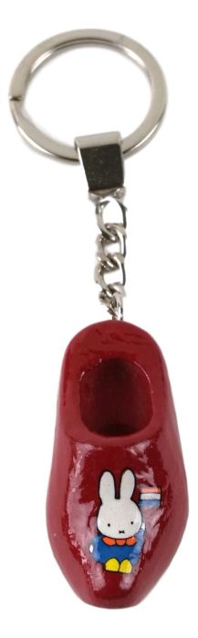 Op deze rode sleutelhanger staat Nijntje afgebeeld in een blauwe boerenkiel en heeft ze een Nederlands vlaggetje in haar hand. Het houten klompje is 4 cm in lengte.