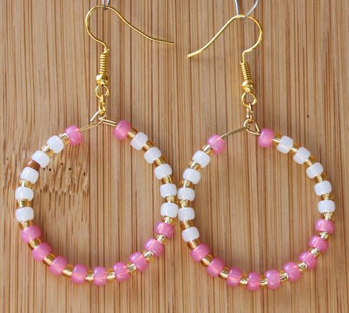 ronde hoepel oorbellen met 4mm Miyuki kralen, alabaster roze en zacht wit met goudkleur kralen.