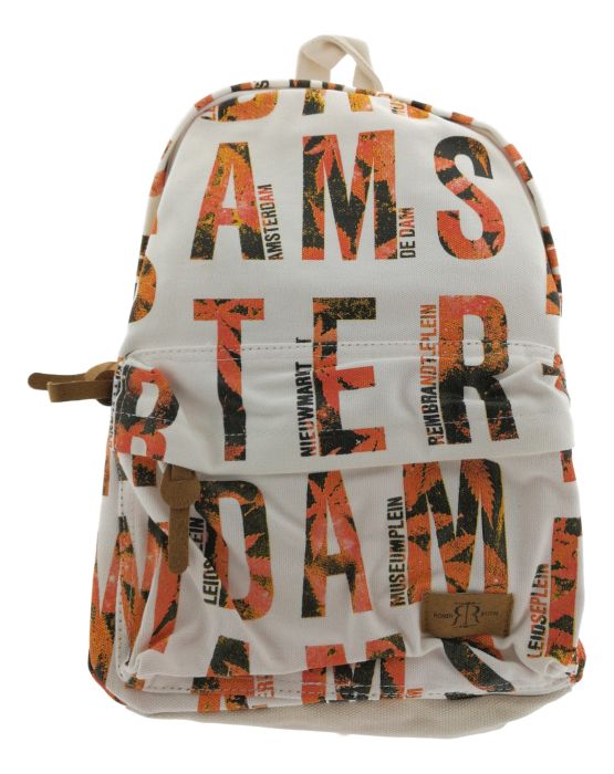 Stevige Robin Ruth rugzak in de kleuren Wit & Orange met als thema "Amsterdam". Versiert met naam "Amsterdam" en de verschillende beroemde trekpleisters: De Dam, Leidseplein, Museumplein, Rembrandplein.