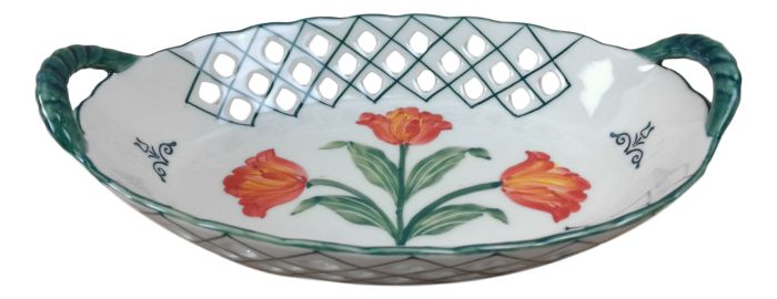 Ovalen schaaltje met oranje tulpen, groen afgebiesd langs de kant. De zijkanten zijn ajour opengewerkt.