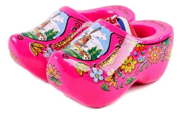 Op de voorkant van het klompje is een geschilderde gekleurde molen , aan de zijkanten staan bloemen. Op de hiel staat de tekst "Holland".