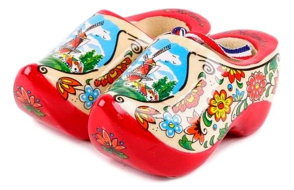 Op de voorkant van het klompje is een geschilderde gekleurde molen , aan de zijkanten staan bloemen. Op de hiel staat de tekst "Holland".