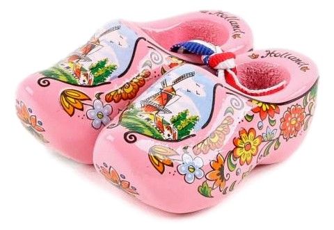 Op de voorkant van het klompje is een geschilderde gekleurde molen , aan de zijkanten staan bloemen. Op de hiel staat de tekst "Holland".