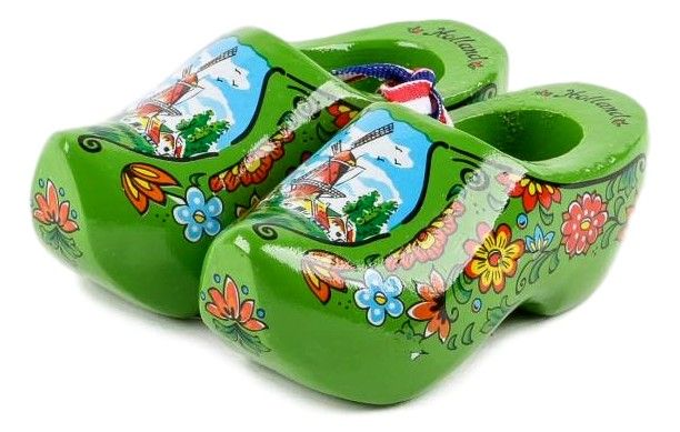 Op de voorkant van het klompje is een geschilderde gekleurde molen , aan de zijkanten staan bloemen. Op de hiel staat de tekst "Holland".