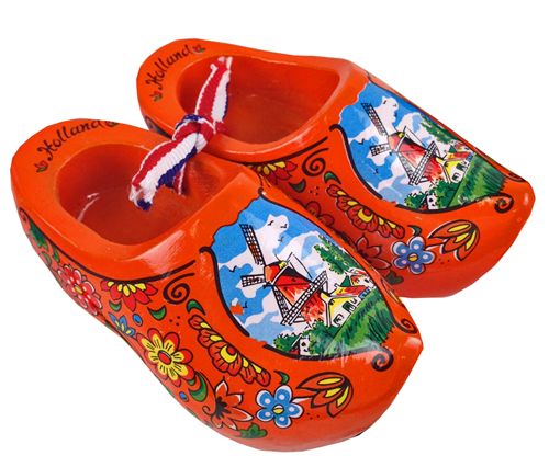 Set van 2 oranje houten klompjes 10cm. groot met delftsblauw strikje.