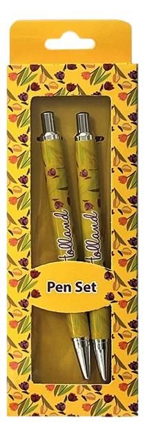Doosje met daarin twee gele balpennen, de pennen zijn versierd met gekleurde tulpen en de tekst 'Holland'.