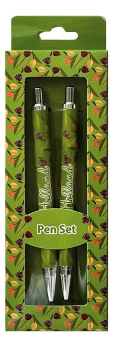 Doosje met daarin twee groene balpennen, de pennen zijn versierd met gekleurde tulpen en de tekst 'Holland'.