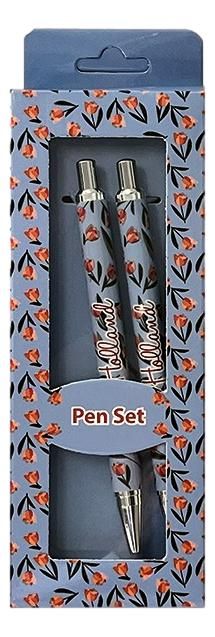 Doosje met daarin twee licht blauwe balpennen, de pennen zijn versierd met gekleurde tulpen en de tekst 'Holland'.