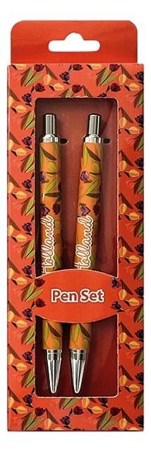 Doosje met daarin twee oranje balpennen, de pennen zijn versierd met gekleurde tulpen en de tekst 'Holland'.