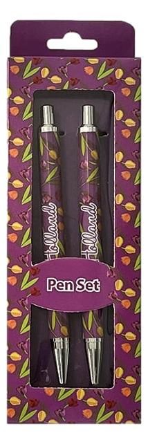 Doosje met daarin twee paarse balpennen, de pennen zijn versierd met gekleurde tulpen en de tekst 'Holland'.
