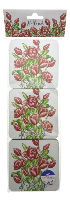Setje van 6 toeristische onderzetters. Mooie rode tulpen op een witte achtergrond met de tekst "Holland". De onderzetters zitten verpakt in een zakje.