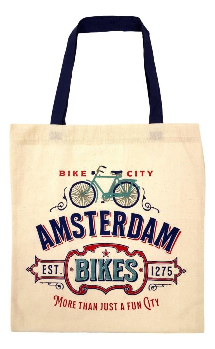 Mooie zwarte draagtas versierd met de tekst "Bike City Amsterdam".