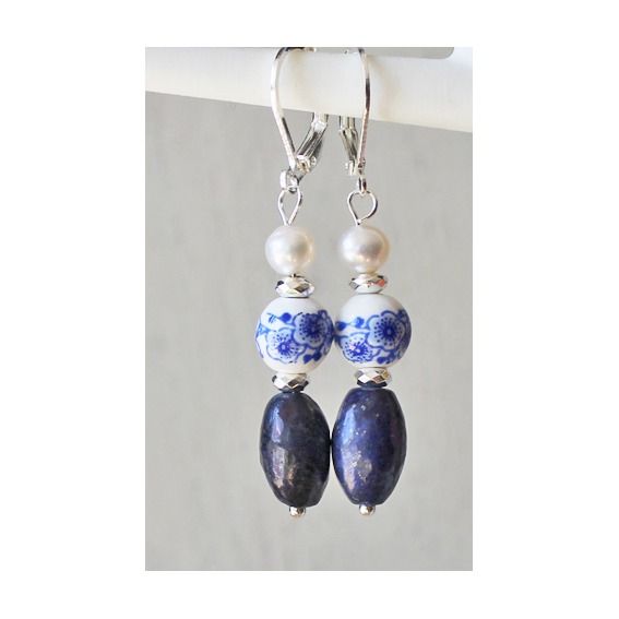 Set oorbellen met een lange lapis lazuli rijstkraal, een ronde 8mm delftsblauwe bloemkraal en een cultive zoetwater pareltje.