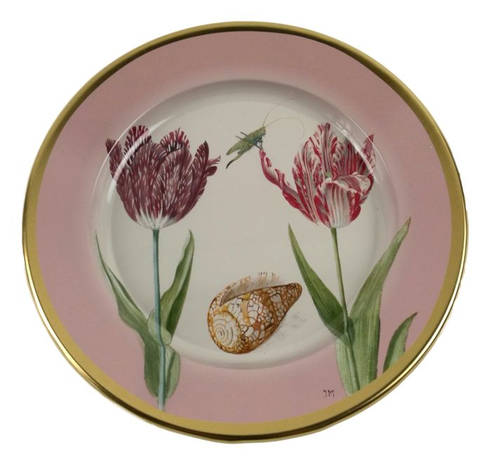 Het bordje is kleurrijk bedrukt met het werk over twee tulpen met insecten uit de Rijksmuseum collectie van Jacob Marrel.