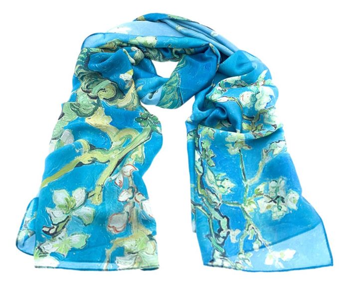 Onze prachtige kunstzijden Amandelbloesem Sjaal, een perfect accessoire om je stijl te versterken en een vleugje kunst toe te voegen aan elke outfit. Deze sjaal is gemaakt van polyester en heeft een levendige achtergrond, versierd met iconische amandelbloesems van Vincent van Gogh.