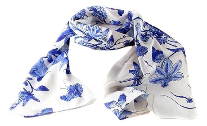 Deze sjaal is gemaakt van hoogwaardige kunstzijde (100% polyester) en is zacht en comfortabel om te dragen, met een zijdeachtige textuur die prachtig valt. Het Delfts Blauwe Vogels-ontwerp is bedrukt met hoogwaardige, levendige inkten die de ingewikkelde details van het tegelpaneel tot leven brengen.
