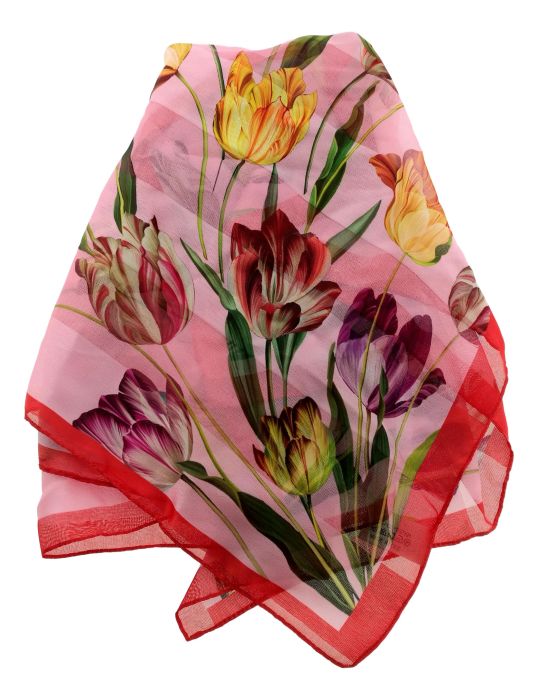 Mooi glanzende en zachte roze sjaal versierd met gekleurde tulpen.